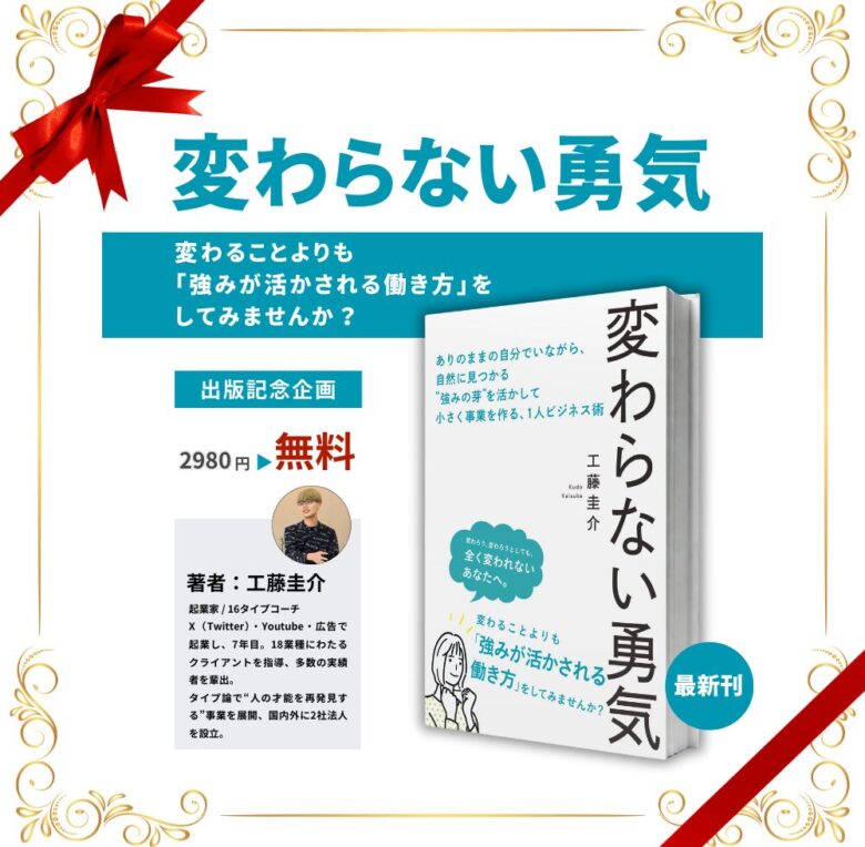 - 現在、出版記念企画として、また書籍の感想を募集しているため、通常価格:2980円の動画書籍を期間限定で無料で配布しています。